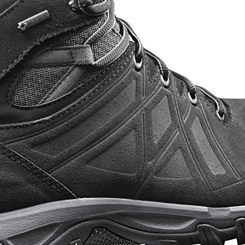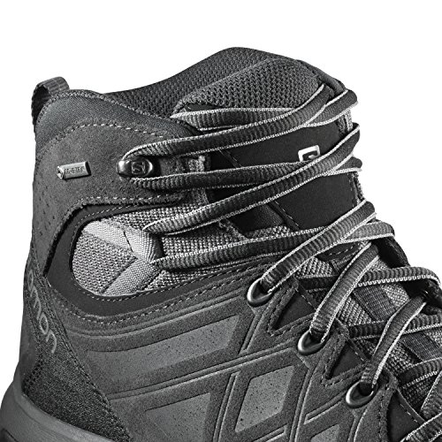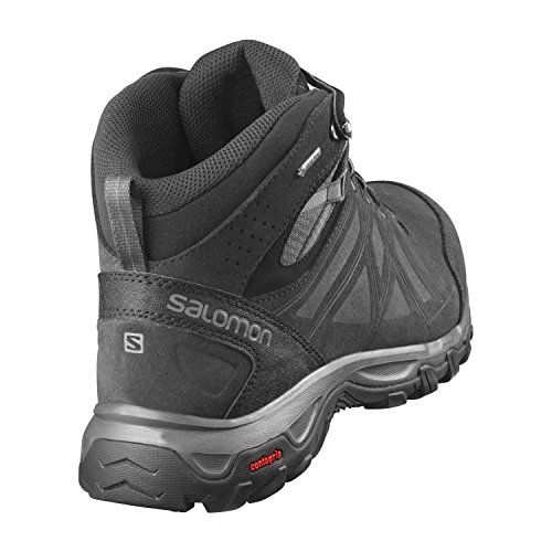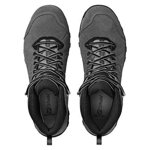Salomon Evasion 2 Mid LTR Gore-Tex Walking stiefel – AW17 Spaltleder und GORE-TEX verleihen dem EVASION 2 MID LTR GTX Schutz und Haltbarkeit. Die halbhohe Konstruktion bietet extra Knöchelschutz und Halt, was insbesondere auf anspruchsvollen Trails entscheidend ist. Dank einer aggressiven Außensohle ist er für jedes Abenteuer und alle Wetterlagen gerüstet. Ein idealer Begleiter für längere Wanderungen oder Mehrtagestouren mit einem Rucksack. Nichts geht über die Authentizität von Leder. Schaft und Zehenschutzkappe sind ganz aus Leder gefertigt, was dem Schuh einen lässigen Hikingschuh-Look und extra Haltbarkeit verleiht. Dieser mit einem bewährten und beliebten Leisten gefertigte Schuh bietet die legendäre Salomon Passform. Eine robuste und aggressive Sohle gibt dir in jedem Terrain einen festen und zuverlässigen Grip.